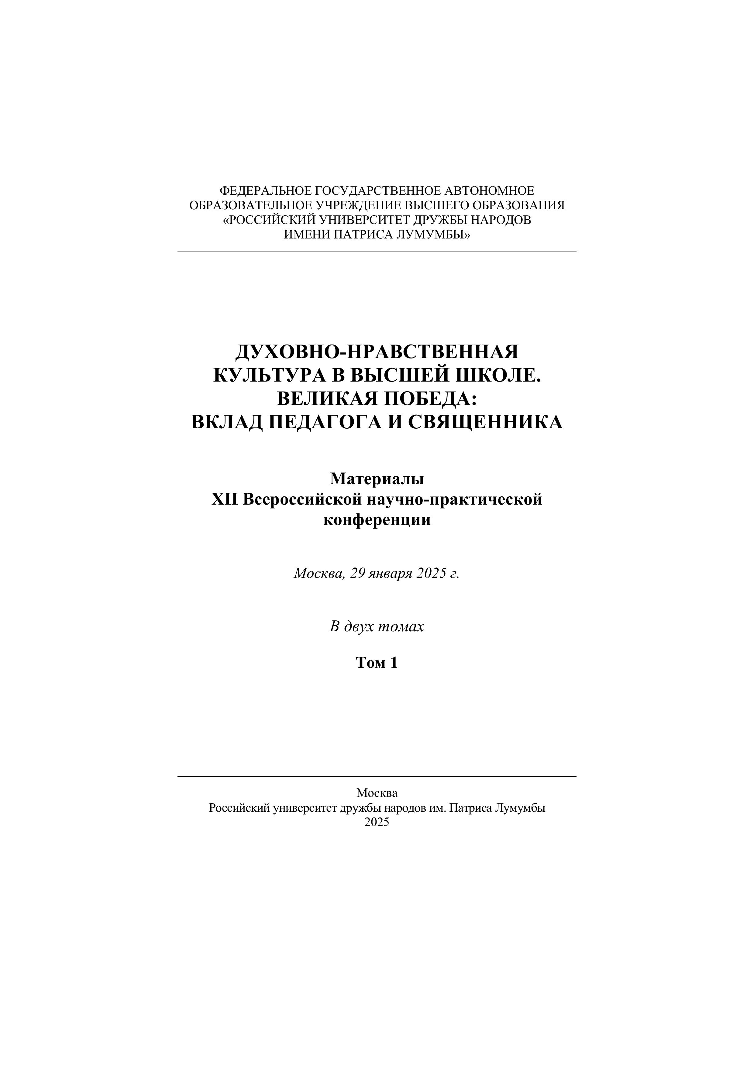 Статья Суходоловой Е.П. опубликована в Сборнике материалов ХII научно-практической конференции "Духовно-нравственная культура в высшей школе. Великая Победа: подвиг педагога и священника"В ноябре 2025 года вышел из печати Сборник материалов ХII научно-практической конференции "Духовно-нравственная культура в высшей школе. Великая Победа: подвиг педагога и священника". Доцент кафедры социально-культурной деятельности и туризма, кандидат педагогических наук, доцент Суходолова Е.П. принимала участие в ХII научно-практической конференции «Духовно-нравственная культура в высшей школе. Великая Победа: вклад педагога и священника», которая состоялась на базе РУДН имени Патриса Лумумбы 29 января 2025 года. Конференция проводилась в рамках реализации программы "Духовно-нравственное воспитание в высшей школе" при поддержке Министерства образования и науки Российской Федерации. По итогам реализации этой программы в 2025 было проведено несколько конференций и готовился к печати сборник научных статей . Итоговая конференция состоялась в рамках ежегодных Рождественских чтений, которые проводятся традиционно в РУДН. Статья Суходоловой Е.П. "Подвиги педагогов Гжельского государственного университета на фронтах Великой Отечественной войны" опубликована в сборнике конференции. Материал статьи посвящен фронтовому пути Азаровой Л.П., Будановой Н.Р., Данилова В.Е., Соколова И.А., Страхова В.Н., Пищика Б.М. Сегодня, как и в годы Великой Отечественной войны, перед вузами страны, наряду с главной задачей подготовки высококвалифицированных специалистов для различных отраслей экономики, стоит и другая, не менее важная, задача – воспитать патриота и гражданина Отечества, сохранить и укрепить традиционные российские духовно-нравственные ценности, не предать забвению героическое прошлое Родины. Ее значимость возросла, как никогда. Подвиги наших педагогов, их фронтовой путь могут стать прекрасным примером для современной молодежи, лучшие представители которой сегодня борются с человеконенавистнической нацистской идеологией, пустившей корни в Европе и на Украине и вновь поставившей мир перед угрозой геноцида народов.