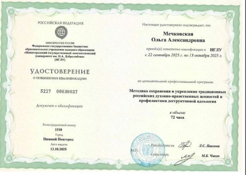 Повышение квалификации С 22 сентября по 13 октября 2025 года старший преподаватель кафедры социально-культурной деятельности и туризма Амамбаева Н. С., заведующая кафедрой социально-культурной деятельности и туризма, кандидат географических наук, доцент Мечковская О. А., доцент кафедры социально-культурной деятельности и туризма, кандидат педагогических наук, доцент, заслуженный учитель Российской Федерации Суходолова Е. П. прошли повышение квалификации по программе «Методика сохранения и укрепления традиционных российских духовно-нравственных ценностей и профилактики деструктивной идеологии» в объеме 72 часа на базе ФГБОУ ВО «Нижегородский государственный лингвистический университет им. Н. А. Добролюбова».